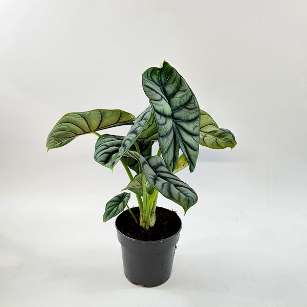 Alocasia ‘Silver Dragon’ is a jewel Alocasia admired for its thick, shield-shaped leaves with a metallic silver surface and dark, pronounced veining. Compact and sculptural, it offers dramatic texture while remaining manageable in size.
