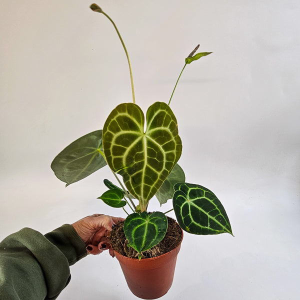 Anthurium clarinervium is a classic velvet-leaf Anthurium prized for its thick, heart-shaped leaves and dramatic white veining. Luxurious and timeless, it is one of the most popular collector Anthuriums.