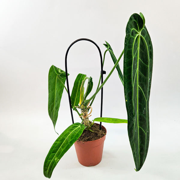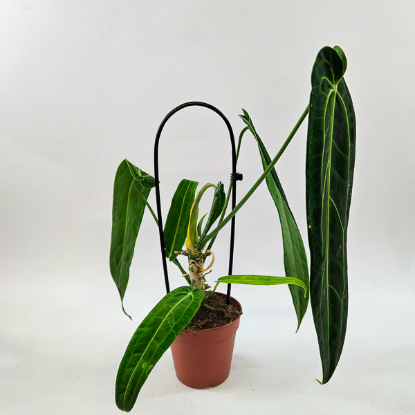 Anthurium warocqueanum, often called the Queen Anthurium, is legendary for its long, velvety, pendant leaves and dramatic silver venation. Regal and demanding, it is considered a cornerstone species in high-end Anthurium collections.