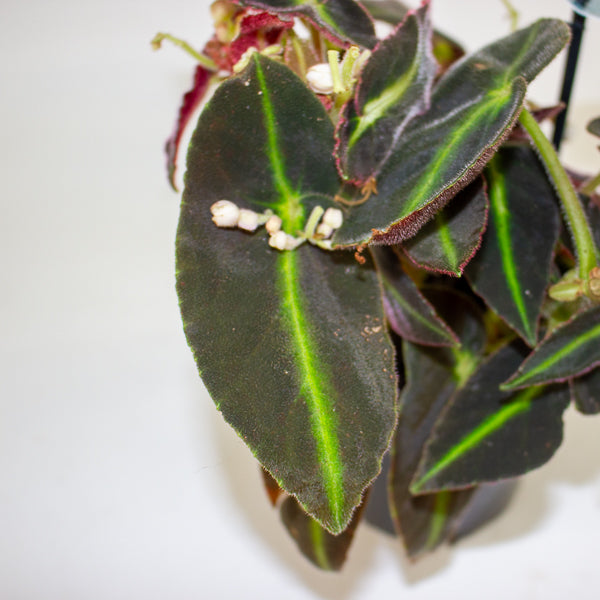 Begonia listada is an elegant species Begonia featuring deep velvety green leaves with a vivid lime midrib and soft red undersides. Compact and refined, it is perfect for terrariums and shaded indoor displays.