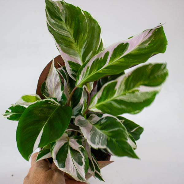 Calathea 'White Miracle' is a striking prayer plant known for its bold green leaves splashed with crisp white variegation. Elegant and eye-catching, it adds a refined contrast to indoor plant displays and thrives in warm, humid environments.