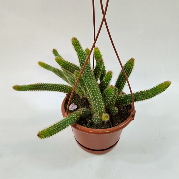 Cleistocactus winteri, commonly known as Golden Rat Tail, is a trailing cactus with long, golden-haired stems that cascade beautifully from pots and hanging baskets. Hardy and distinctive, it brings texture and warmth to bright interiors.