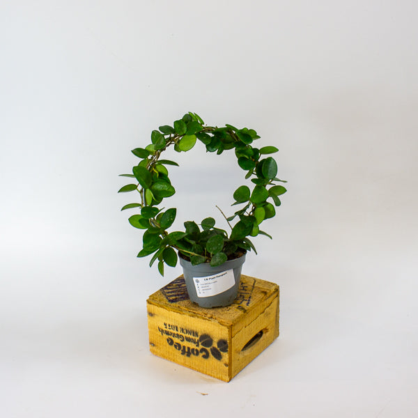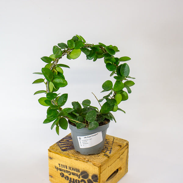 Hoya ‘Mathilde’ is a hybrid between Hoya carnosa and Hoya serpens, known for its small, round, fuzzy leaves and clusters of sweetly scented, starry white flowers. Training it on a trellis showcases its compact, cascading growth.