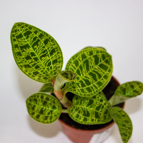 Macodes petola, commonly known as the Jewel Orchid, is a terrestrial orchid prized for its dark green, velvety leaves with intricate gold veining. Native to Southeast Asia, it thrives in high humidity and low to medium light, making it ideal for terrariums and shaded indoor spaces.
