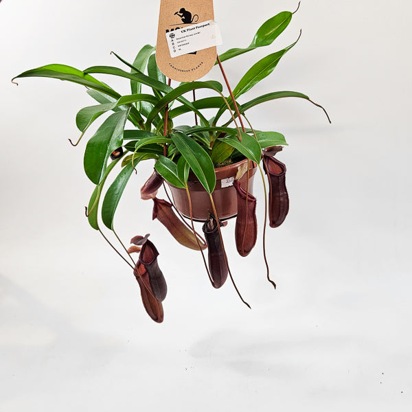Nepenthes ‘Monkey Jars – Bill’ is a tropical pitcher plant featuring elongated, colourful traps used to capture insects. Both functional and sculptural, it adds drama and botanical interest to bright, humid spaces.